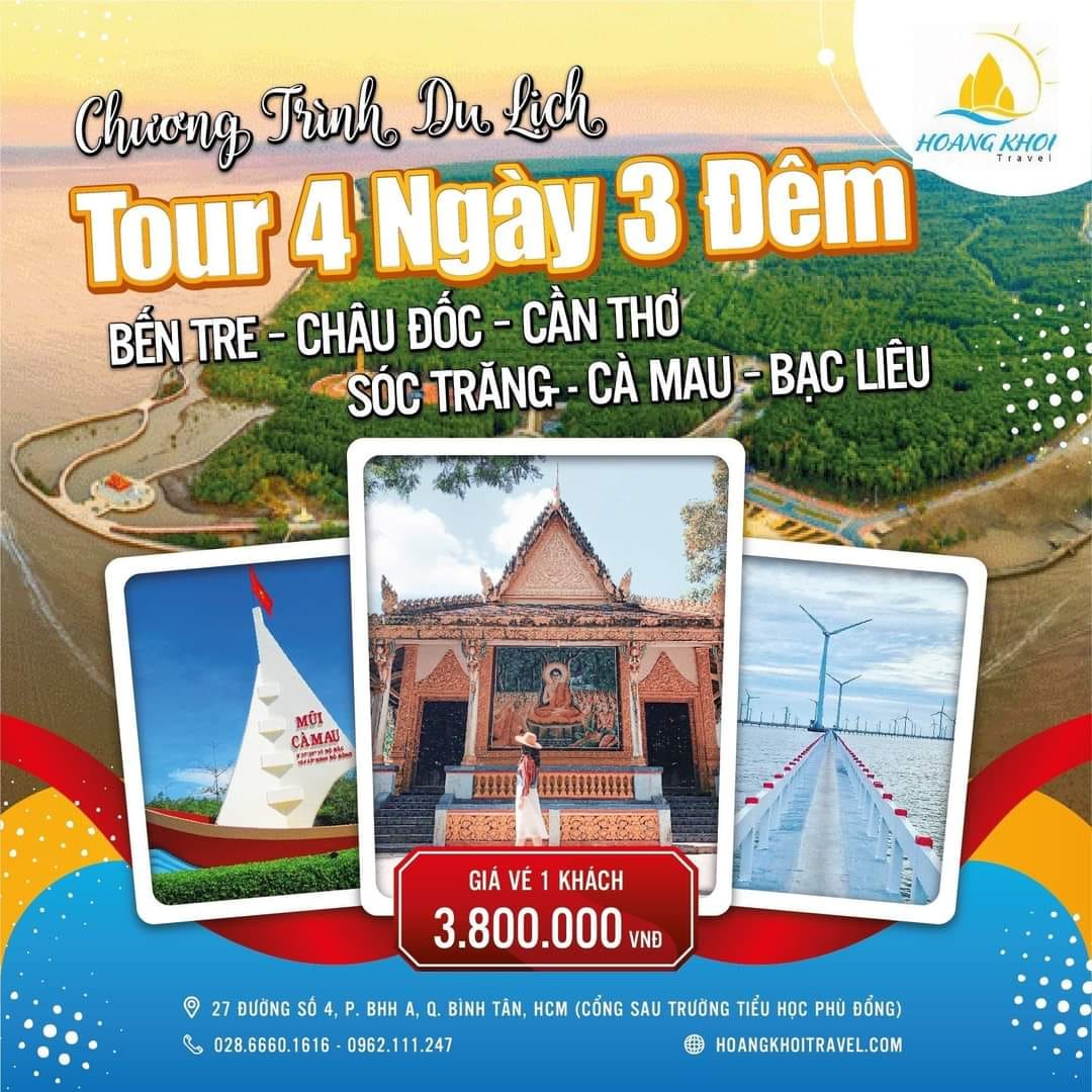 – Tour lục tỉnh Miền Tây 4 ngày 3 đêm của Hoàng Khỏi Travel khởi hành hàng thứ 2& 5 hàng tuần.